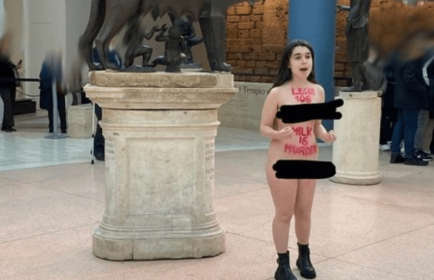 Maria Sofia Federico, durante l’azione firmata a Ribellione Animale, questa mattina si è spogliata completamente nuda ai Musei Capitolini con uno slogan scritto in rosso sul ventre che recitava “milk is murder”, cioè “il latte è un omicidio”.