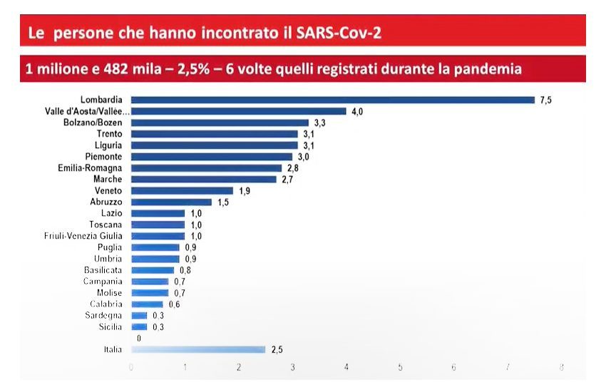 Secondo quanto comunicato oggi in conferenza stampa dal Ministero della Salute e dall’Istat il 2,5% della popolazione italiana sarebbe entrata in contatto con il nuovo coronavirus.
