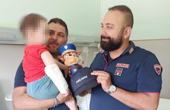 Il giorno seguente i poliziotti autori dell’azione di soccorso, Giuseppe e Fabio, hanno fatto visita al piccolo, strappando qualche sorriso e donando alcuni gadget della Polizia di Stato.