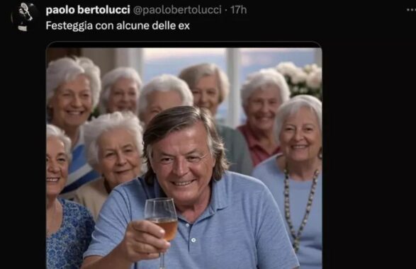 Nel post, Bertolucci ha condiviso un’immagine generata con intelligenza artificiale che mostra Panatta mentre brinda con un gruppo di signore dai capelli grigi, accompagnata da una frase altrettanto pungente: “Festeggia con alcune delle ex”.
