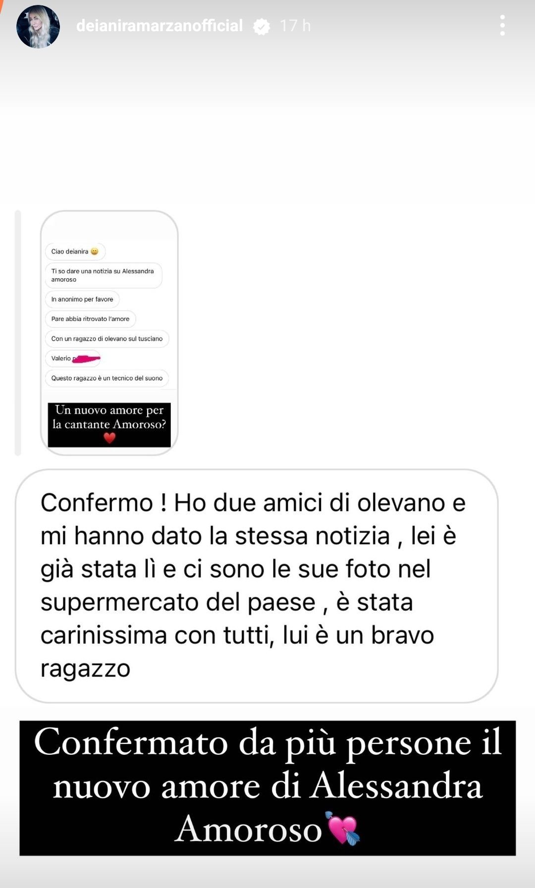Il nuovo (presunto) fidanzato di Alessandra Amoroso si chiamerebbe Valerio e sarebbe un tecnico del suono di origini campane, più precisamente di Olévano sul Tusciano, una cittadina della provincia di Salerno dove la stessa Amoroso è stata avvistata in un supermercato insieme a lui dagli abitanti del posto che avrebbe salutato con molta gentilezza. Tra le informazioni che abbiamo a disposizione su questa persona c’è l’età, 28 anni, quindi classe 1994 e luogo di nascita, Eboli e dal suo profilo Instagram sembrerebbe che questo ragazzo abbia lavorato a molti concerti tra cui anche quello dei Litfiba.