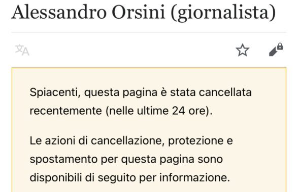 Il docente e giornalista Alessandro Orsini è stato cancellato da Wikipedia, enciclopedia libera, nonostante la pagina sia ancora indicizzata sui motori di ricerca. Uno degli editor e moderatori di Wikipedia Italia ha risposto alle polemiche spiegando i motivi della rimozione, nella sezione “discussioni/contribuiti” della piattaforma. Queste le sue parole: “Vuoi un motivo? Il testo della voce era innanzitutto un curriculum vitae che era stato copiato da un sito (quindi, l’immediata per WP:COPYRIGHT ci stava tutta ed era un atto dovuto). Secondo motivo: era pure scritto con i piedi perché era un vero e proprio cv in stile “Linkedin”: anche in questo caso ci stava la rimozione immediata. Gli IP che continuavano a creare la voce continuavano a mettere stolidamente sempre gli stessi contenuti, per non parlare poi dei titoli con cui creavano la voce (“Prof. Alessandro Orsini”, “Alessandro Orsini patriota” e via discorrendo)”.