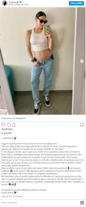 Nel post su Instagram, pieno di nostalgia, ma anche di consapevolezza per quello che sta per accadere, Giulia Pauselli ha scritto: “Oggi ho sgomberato il mio camerino da 5 meravigliosi anni…Non più body, scalda muscoli, punte, tacchi e costumi di scena…non più tappetini e attrezzi per allenarmi in quella che ho sempre definito la “mia tana”. Il mio rifugio a lavoro, quel luogo in cui tutto il mio universo ruotava fino a 6 mesi fa. Adesso per un po’ il mio universo girerà su tutt’altro satellite senza dimenticare però che una parte di me sarà sempre qui e riconoscente per questi anni fatti di sacrifici e tanto amore per questo programma. Non smetterò mai di essere grata per avermi fatto vivere la gravidanza da donna e ballerina senza avermi fatto pesare questa condizione ma anzi sostenendomi nelle scelte man mano che il mio corpo e le esigenze cambiavano. Mi mancherà tutto di questo posto, anche le difficoltà ed i giorni più pesanti sicura che forse un giorno tornerò più forte di prima che la mia nuova vita da mamma potrà darmi una carica ed una risposta diversa a qualsiasi complessità troverò nella vita e sul posto di lavoro”.