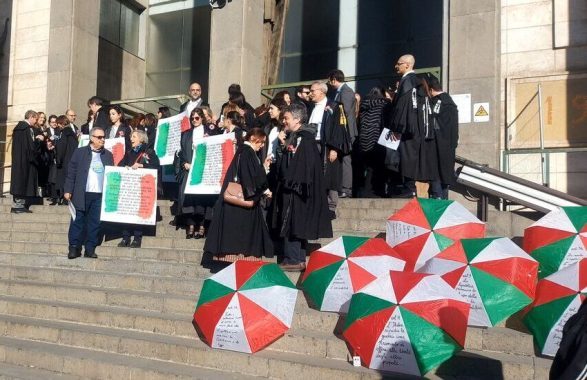 Magistrati sulla scalinata d’ingresso del Palazzo di Giustizia in toga, con una coccarda tricolore e manifesti con frasi a difesa della Costituzione di Pietro Calamandrei, Luigi Sturzo, Sandro Pertini, Liliana Segre e Roberto Benigni e ombrelli ‘tricolori, con riportati alcuni articoli della Costituzione: il nove, l’undici, il tredici, il ventuno e il trentaquattro.