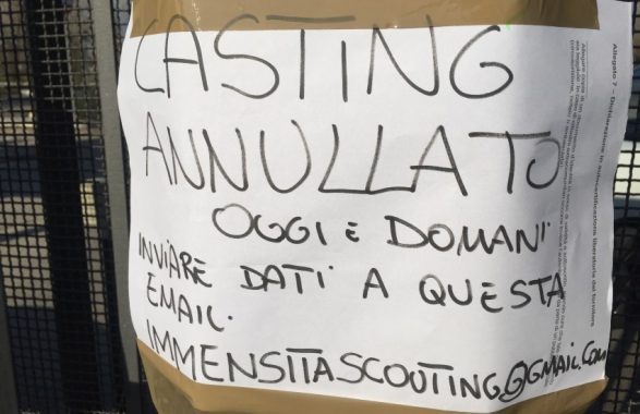 Al momento della sospensione, la produzione ha affisso un cartello all’entrata comunicando la cancellazione dell’appuntamento.