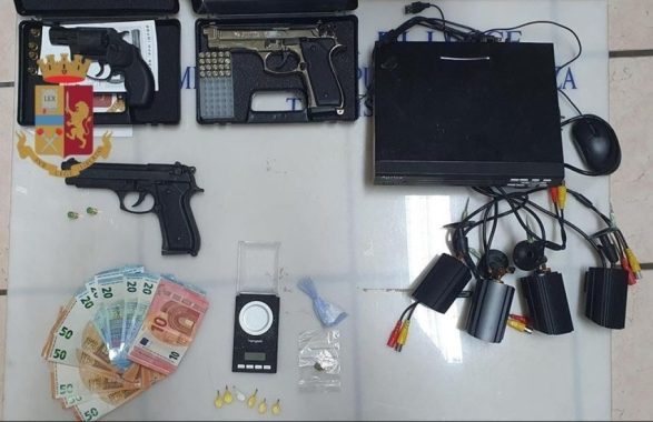 La successiva perquisizione a casa del giovane, infatti, ha permesso poi di ritrovare sei dosi di cocaina, per un peso complessivo di oltre 5 grammi e una di marijuana, adeguatamente confezionate e pronte per la vendita; un bilancino elettronico di precisione; altro materiale per il confezionamento della sostanza stupefacente; 520 euro in contanti, in banconote di diverso taglio, probabile incasso della serata; tre pistole a salve, marca Bruni mod. 92, tutte prive del tappo rosso, con 27 cartucce a salve. Tutto questo materiale ritrovato, insieme al sistema di videosorveglianza abusivo composto da 4 telecamere opportunamente orientate per le riprese esterne all’abitazione, è stato sequestrato e messo a disposizione dell’Autorità Giudiziaria, mentre il 22enne è stato arrestato per spaccio e, su disposizione del P.M., è scattata la misura degli arresti domiciliari in attesa del giudizio di convalida.