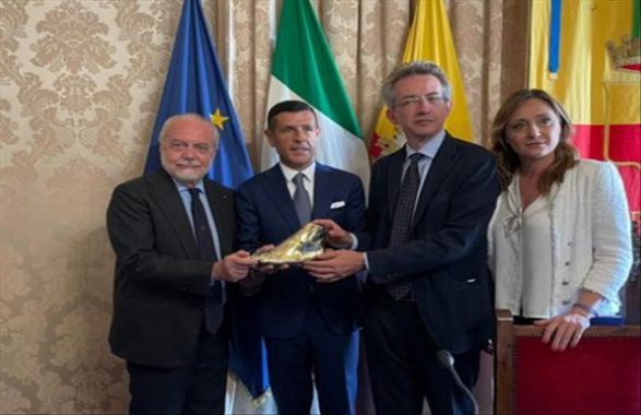 Nella sala Giunta di Palazzo San Giacomo era presente anche Aurelio De Laurentiis, presidente del Napoli, che ha ricevuto una riproduzione limitata del piede sinistro di Maradona.