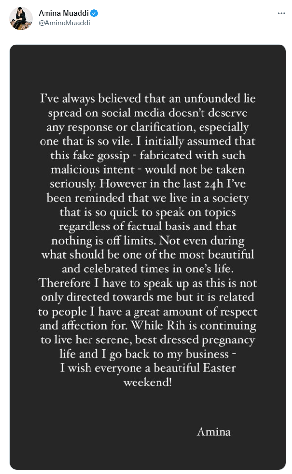 “Nelle ultime 24 ore mi è stato ricordato che viviamo in una società veloce a parlare di argomenti indipendentemente dal fatto che abbiano o no alcun fondamento”, ha scritto sui social Amina Muaddi, che riferendosi proprio alla gravidanza di Rihanna ha poi aggiunto: “Neanche durante quello che dovrebbe essere uno dei momenti più belli e celebrati nella vita di qualcuno. Di conseguenza devo parlare perché questa cosa non è diretta solo a me, ma è legata a persone per le quali nutro tanta stima e affetto”.