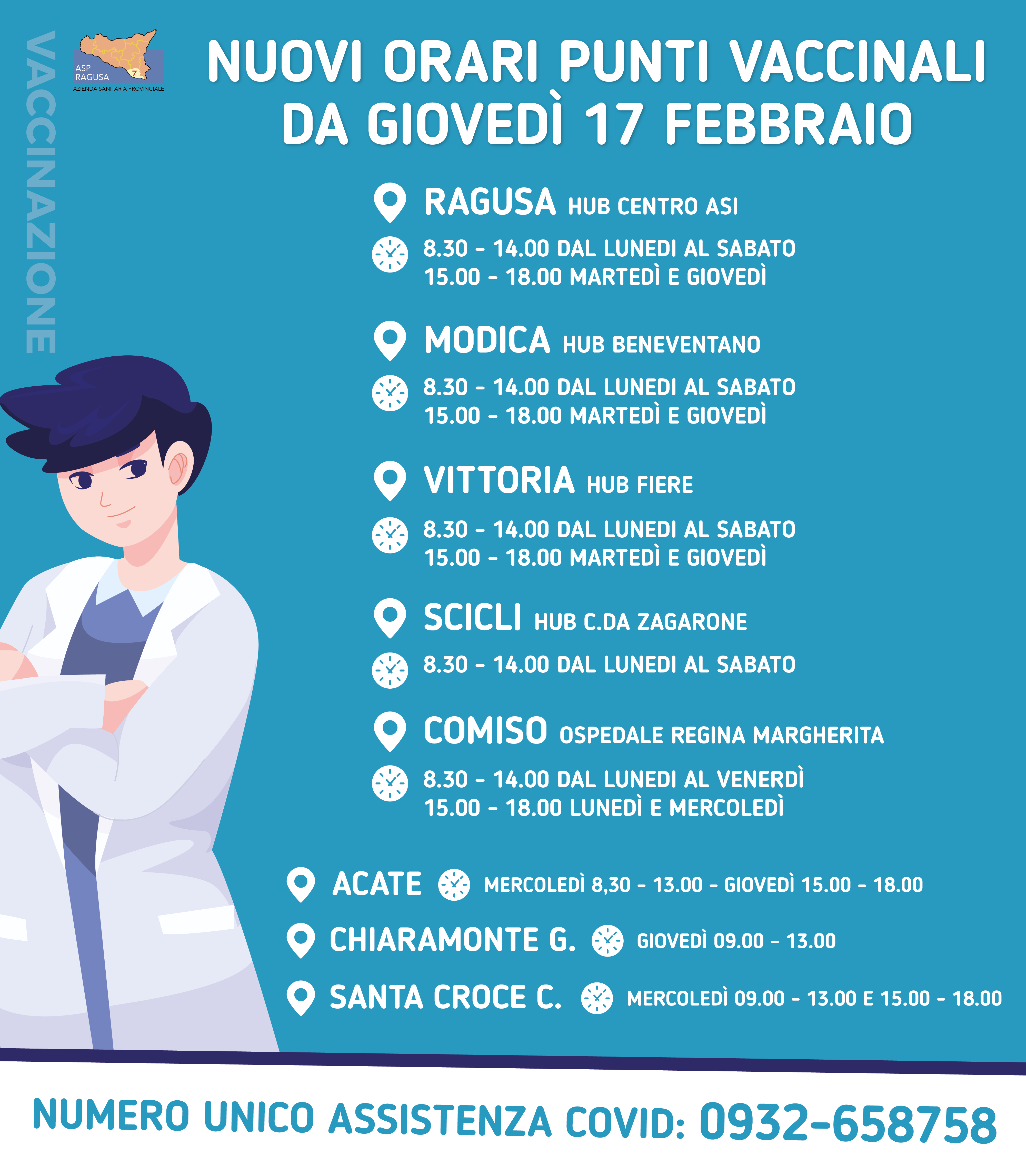 L’Azienda Sanitaria di Ragusa comunica che a partire da giovedì 17 febbraio c.a. negli HUB e nei Centri vaccinali aziendali si osserveranno nuovi orari.