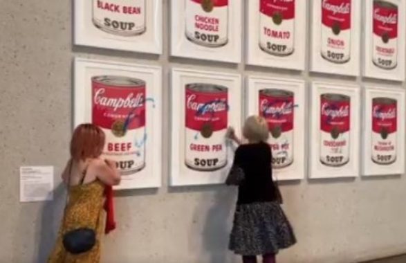 Nella National Gallery of Australia due donne appartenenti al gruppo “Stop Fossil Fuel Subsides Australia” hanno prima imbrattato con una vernice blu le famose serigrafie “Campbell’s Soup” di Warhol, dopodiché hanno incollato le loro mani alle protezioni trasparenti.