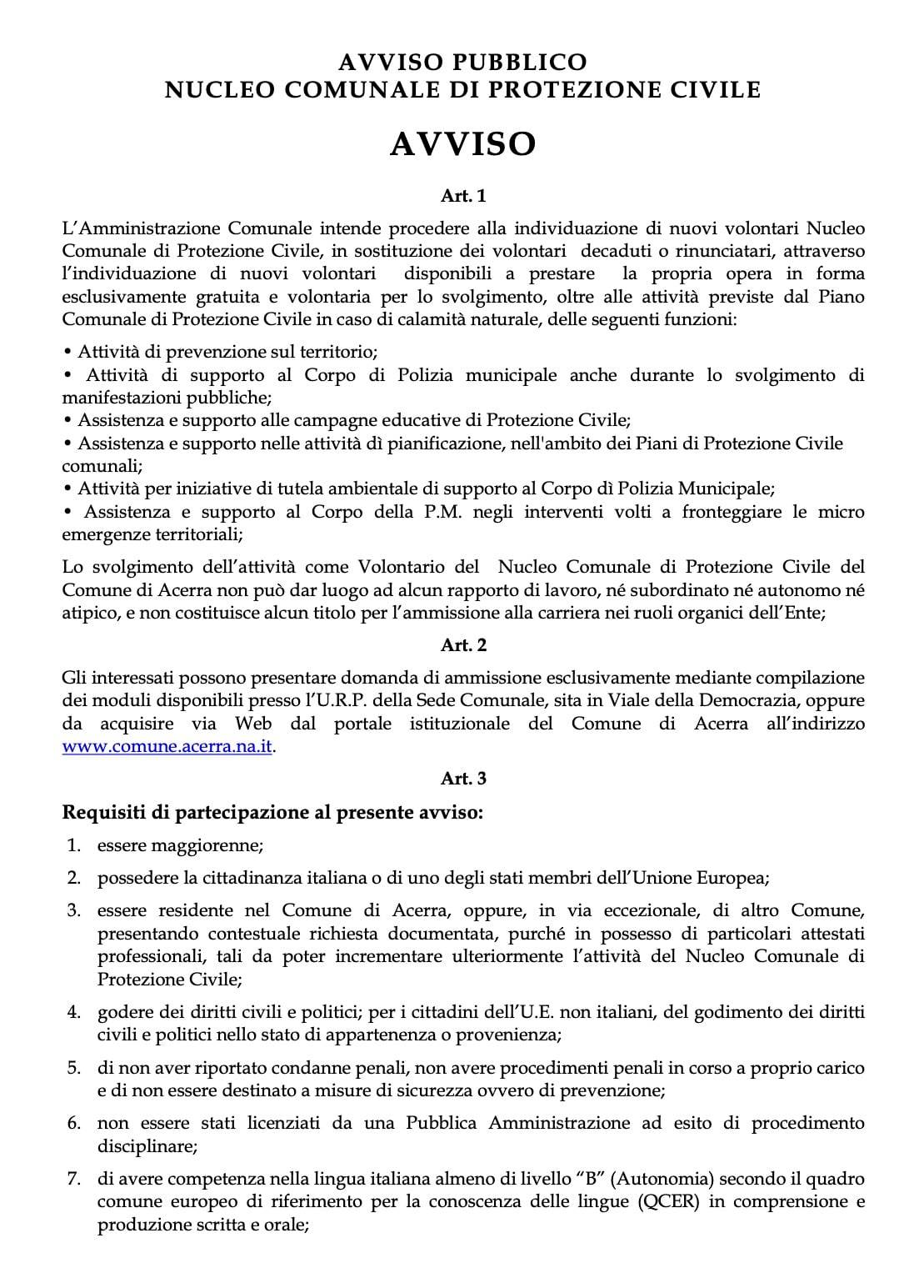 Il Sindaco Raffaele Lettieri, usando il suo profilo facebook, ha comunicato la pubblicazione del bando per diventare volontario del nucleo della Protezione Civile di Acerra.