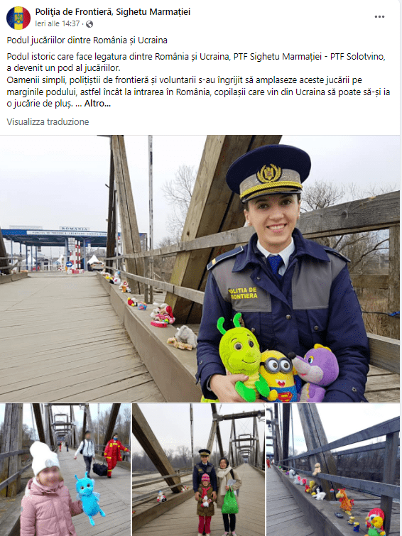 “La gente comune, le guardie di frontiera e i volontari hanno posizionato questi giocattoli ai bordi del ponte, in questo modo i bambini provenienti dall’Ucraina potranno prenderne uno al loro arrivo in Romania”. Queste le parole pubblicate con le immagini, che sono state diffuse sui social dall’account della polizia di frontiera e sono diventate virali.