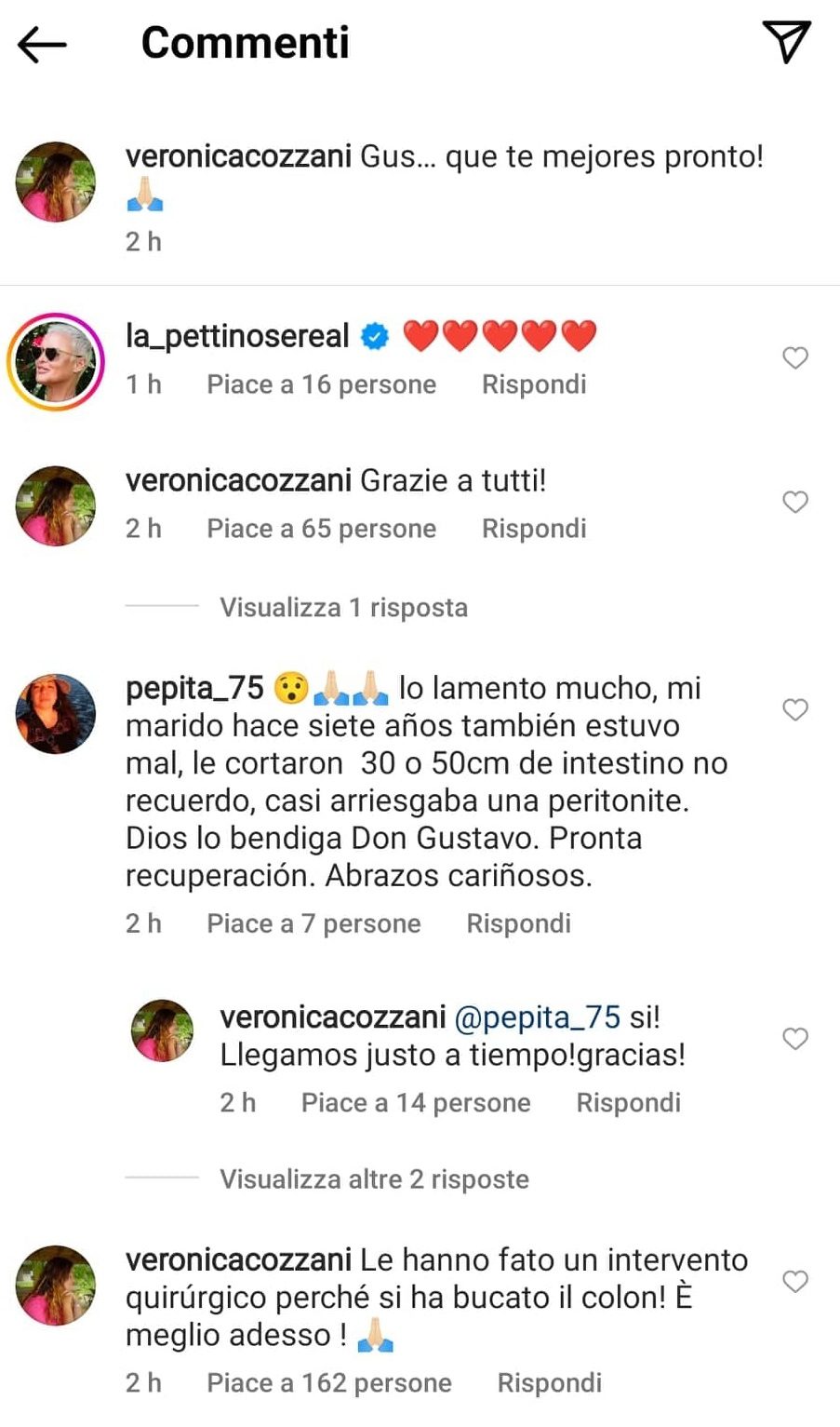 La signora spiega che Gustavo ha subito un delicato intervento al colon, ma ha scritto nel post che li ritrae insieme che adesso sta meglio e ha ringraziato tutti i followers per la vicinanza mostrata anche nei commenti rilasciati. La foto è stata in seguito postata anche da Cecilia, che ha scritto “Li amo con tutto il cuore, sono la mia forza”.