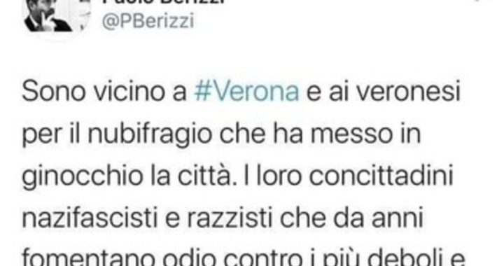 Ha scatenato molte polemiche un tweet del giornalista di Repubblica Paolo Berizzi, apparso oggi sul suo account Twitter e diretto a Verona e al devastante nubifragio di ieri sera.