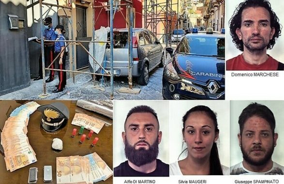 I Carabinieri del Nucleo Operativo della Compagnia di Piazza Dante, coadiuvati dai colleghi della Stazione, della Compagnia d’Intervento Operativo del XII° Reggimento Sicilia e del Nucleo Cinofili di Nicolosi, hanno arrestato nella flagranza il 29enne Alfio DI MARTINO, la convivente 24enne Silvia MAUGERI, il 31enne Giuseppe SPAMPINATO e il 42enne Domenico MARCHESE, tutti catanesi e ritenuti responsabili nel concorso in spaccio e detenzione illecita di sostanze stupefacenti.