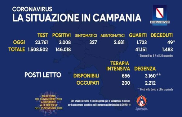 Dopo gli ultimi giorni in cui si era registrato un lieve calo, sale nuovamente la curva dei contagi che supera nuovamente i 3.000 casi. In totale sono stati 3.008 i positivi, con 49 deceduti.