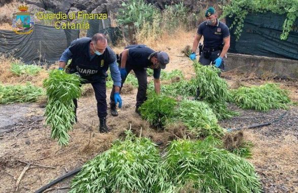 Nel corso di un sorvolo nelle campagne di Bronte, un’unità aerea aveva individuato un campo di circa ½ ettaro, ben occultato tra gli anfratti lavici ed un frutteto, ove si stava coltivando marijuana.