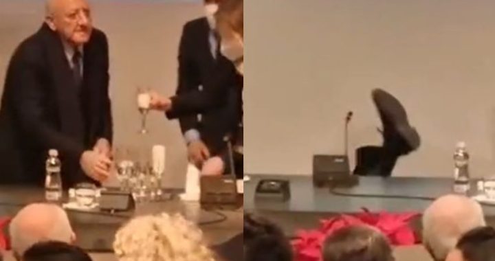 Dopo la caduta De Luca ha proseguito la cerimonia come se nulla fosse e ha avuto anche modo e tempo di scherzare con un ospite presente in sala invitandolo a salire sul palco e brindare con lui. De Luca, soprannominato lo sceriffo per la sua goliardica inflessibilità durante il periodo di pandemia, si conferma una personaggio “sui generis” capace di suscitare ilarità anche nei momenti più delicati.