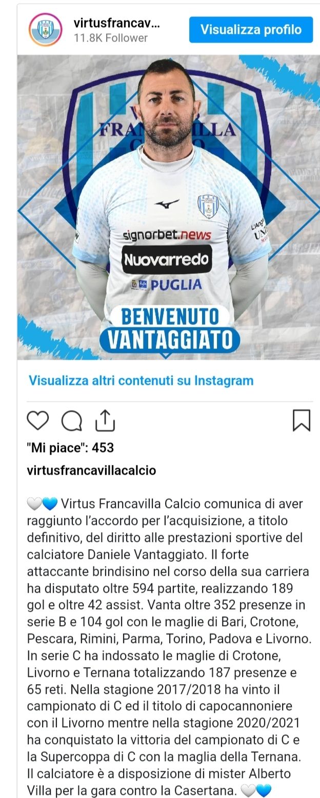L’ attaccante brindisino nel corso della sua carriera ha disputato oltre 594 partite, realizzando 189 gol e oltre 42 assist. Vantaggiato ha raggiunto ben 352 presenze in serie B e 104 gol con le maglie di Bari, Crotone, Pescara, Rimini, Parma, Torino, Padova e Livorno. Di seguito la foto pubblicata dal club sui social.