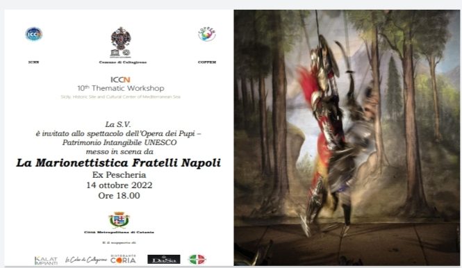 Il programma: venerdì 14 ottobre, a Palazzo Libertini di San Marco, alle 9,30 la cerimonia di apertura con i saluti di benvenuto del sindaco di Caltagirone Fabio Roccuzzo, del segretario generale del Coppem Francesco Sammaritano, del direttore ICCN Euromed Regional Office Natale Giordano, della presidente ICCN Marta Trenzano Rubio (sindaca di Algemesì, in Spagna); dalle 10 i saluti istituzionali del commissario straordinario della Città metropolitana di Catania Federico Portoghese, del presidente del Distretto turistico del Sud Est Corrado Figura (sindaco di Noto), della Commissione nazionale Unesco e del prefetto di Catania Maria Carmela Librizzi; alle 11 l’inizio dei lavori con l’introduzione di Paolo Patanè (direttore ente gestore sito UNESCO “Città Tardo Barocche del Val di Noto”) e, dalle 11,30, l’approfondimento del tema “Le Eredità immateriali: Governance e comunità locali” con la trattazione dei casi di studio “Le Feste delle Grandi Macchine a Spalla” (Patrizia Nardi), “La Dieta Mediterranea – Video Best Practices”, “La Settimana Santa” (Concetta Cataldo), “Le Vie dei Tesori” (Laura Anello), “La luminaria di San Giacomo, effimero e machina eroica” (Claudio Lo Monaco); alle 12,30 le conclusioni. Ripresa dei lavori alle 15 con gli interventi dei membri ICCN: Associazione Lituana dei Governi locali e regionali (Mudite Priede/Elita Kresse), COPPEM/ICCN Euromed Regional Office (Natale Giordano): alle 17 la chiusura dei lavori; alle 18, nell’ex pescheria, spettacolo Opera dei Pupi dei fratelli Napoli.
