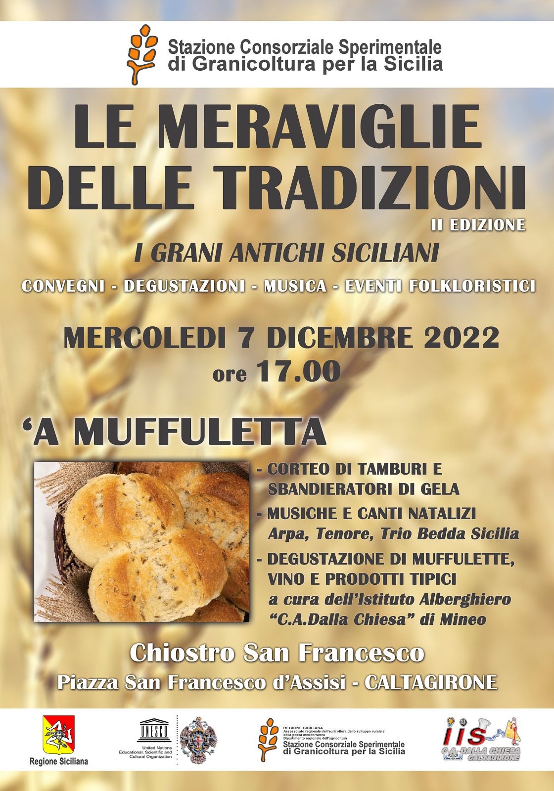 Mercoledì 7 dicembre, vigilia dell’Immacolata Concezione, patrona del Regno delle Due Sicilie, nella Chiesa di San Francesco d’Assisi all’Immacolata, alle 18,30, Solenni Vespri con la partecipazione delle autorità civili. Per “#Lumina in gusto e tradizione”, a cura della Stazione sperimentale di Granicoltura per la Sicilia, “Le Meraviglie delle tradizioni – I grani antichi siciliani, a muffuletta”: dalle 17, nel Chiostro di San Francesco (in piazza San Francesco d’Assisi), corteo di tamburi e sbandieratori di Gela, musiche e canti natalizi (arpa, tenore, Trio Bedda Sicilia), degustazione di “muffulette” (panini con semi di finocchio), vino e prodotti tipici a cura dell’Istituto alberghiero “Dalla Chiesa” di Mineo; alle 18, nella Corte Libertini (via Volta Libertini), “Notte delle muffulette”, con l’inaugurazione del presepe di Giuseppe Grimaldi e “Aperilumina”, a cura dell’Its Alberghiero Cucuzza – Euclide.