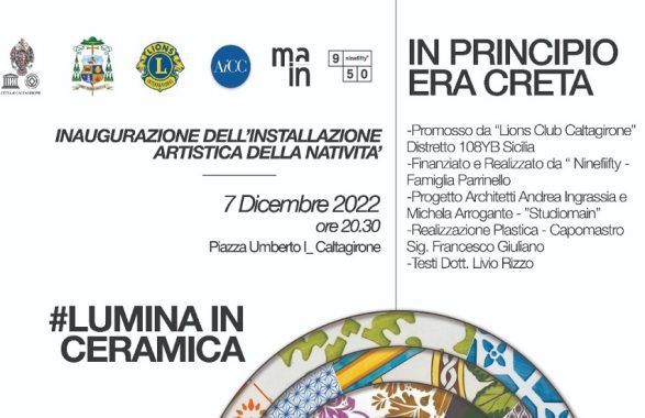 Alle 20,30, in piazza Umberto, per “#Lumina in ceramica”, inaugurazione dell’installazione artistica della Natività “In principio era creta”, su iniziativa del Lions Club di Caltagirone – Distretto 108Yb Sicilia. L’opera, progettata da Andrea Ingrassia e Michela Arrogante, architetti di “Studiomain”, è stata finanziata e realizzata da “Ninefifty” della famiglia Parrinello, mentre la realizzazione plastica si deve a Francesco Giuliano. Testi di Livio Rizzo.