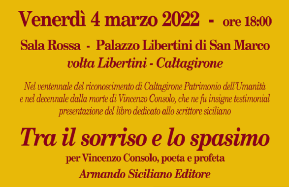 Su iniziativa dell’assessorato ai Beni culturali e Patrimonio Unesco e dell’assessorato alla Legalità e alla Sicurezza, venerdì 4 marzo, alle 18, nella Sala rossa del Palazzo Libertini di San Marco, nel ventennale del riconoscimento di Caltagirone quale Patrimonio dell’Umanità e nel decennale della morte di Vincenzo Consolo, che ne fu insigne testimonial, si terrà la presentazione del libro dedicato allo scrittore siciliano “Tra il sorriso e lo spasimo – Per Vincenzo Consolo, poeta e profeta” – Armando Siciliano Editore.