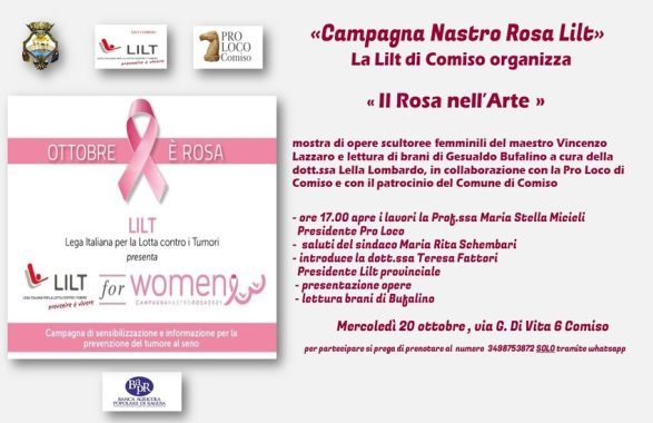 Anche la Lilt di Comiso offre un grande contributo alla “Campagna Nastro Rosa Lilt” del mese di ottobre: mercoledì 20 alle ore 17.00, infatti, in collaborazione con la Pro Loco di Comiso sita in via G. Di Vita n. 6, e con il patrocinio gratuito del Comune di Comiso, si terrà l’incontro “ IL ROSA NELL’ARTE”.