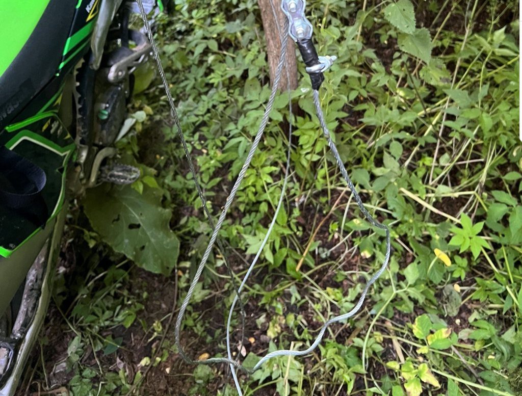 Si è trovato a terra, bloccato da un cappio scorrevole di acciaio con passante scorsoio che ne ha immobilizzato il collo al manubrio.
