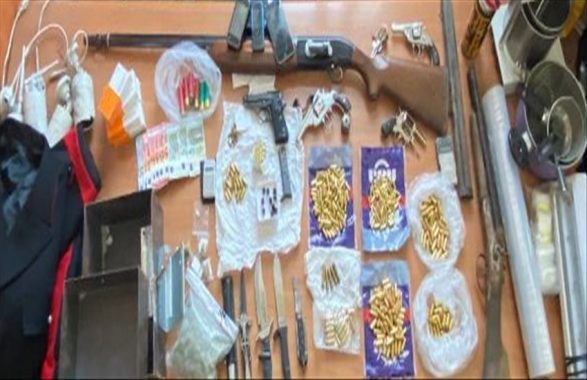 Una volta concluse le ricerche e avviate le perquisizioni la lista degli oggetti da riportare sul verbale diventa molto lunga. Infatti, prima in un terreno e poi in un’abitazione in uso ai due familiari, vengono ritrovate 2 armi lunghe, una delle quali con matricola abrasa, 4 pistole con matricola abrasa, 4 coltelli, 336 cartucce di diverso calibro, 10 ogive, 85 grammi di marijuana, 5 dosi già confezionate della stessa sostanza, una dose di cocaina, un manganello, 3 bilancini di precisione, 1 ordigno esplosivo e un’uniforme da Carabiniere.