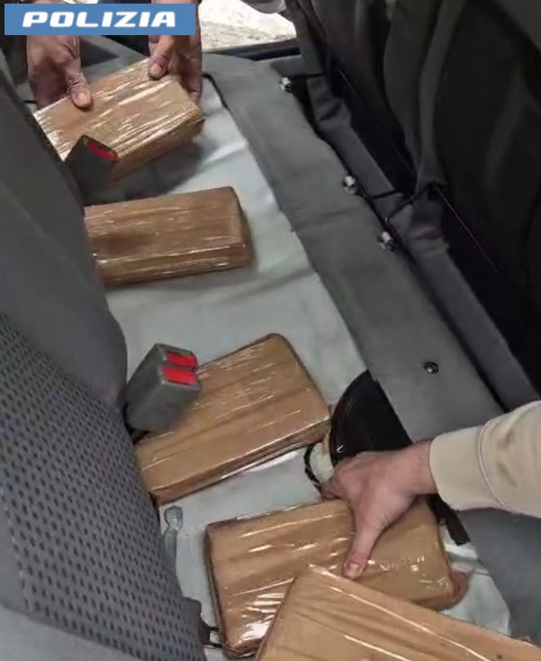 L’ispezione è stata estesa anche alla sua auto, dove, nascosti sotto i sedili posteriori, sono stati trovati cinque panetti di cocaina, avvolti in carta da imballaggio, per un peso complessivo di 5,625 chilogrammi.