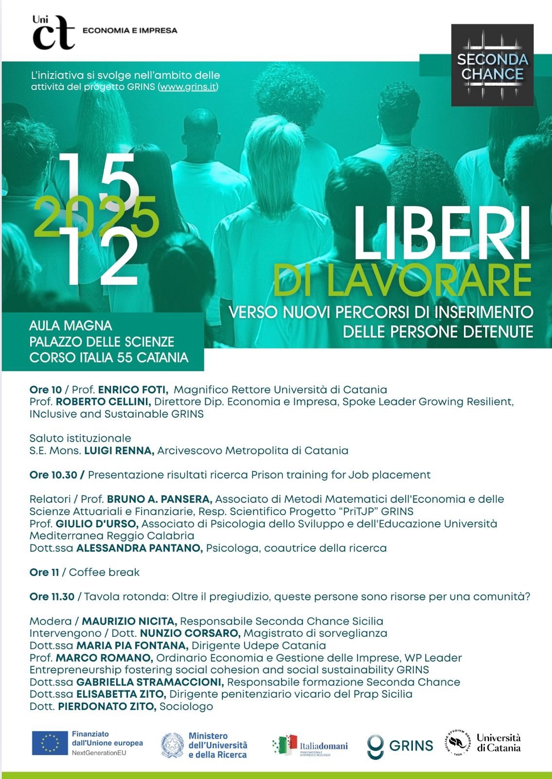 Il programma della giornata prevede l’inizio dei lavori dalle 10 con l’introduzione di Enrico Foti, Magnifico Rettore dell’Università di Catania, e di Roberto Cellini, direttore Dipartimento Economia e Impresa, Spoke Leader Growing Resilient, Inclusive and Sustainable GRINS. Alle 10,30 verranno presentati i risultati della ricerca Prison training for Job placement, e le relazioni di Bruno Pansera, Associato di Metodi Matematici dell’Economia e delle Scienze Attuariali e Finanziarie, responsabile scientifico Progetto “PriTJP” GRINS, Giulio D’Urso, Associato di Psicologia dello Sviluppo e dell’Educazione dell’Università Mediterranea Reggio Calabria e Alessandra Pantano psicologa, coautrice della ricerca.