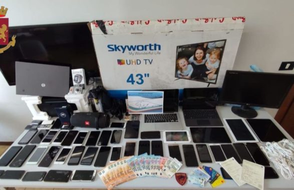 Accertamenti esperiti nell’immediatezza dei fatti permettevano di riscontrare quanto dichiarato dalla vittima: all’interno dell’appartamento, infatti, veniva rinvenuto il telefono cellulare rubato il giorno prima, insieme a numeroso materiale ritenuto di provenienza furtiva: 47 smartphone; 3 televisori di ultima generazione; 3 orologi interattivi; 59 cavetti usb; 1 Playstation; 1 cassa bluetooth; 1 stampante; 6 tablet; 2 notebook; diverse borse da donna ancora confezionate, oltre a vari documenti di identità, carte bancomat e permessi di soggiorno, oltre alla somma di seicento euro in contanti. Tutto il materiale rinvenuto veniva prontamente sequestrato.