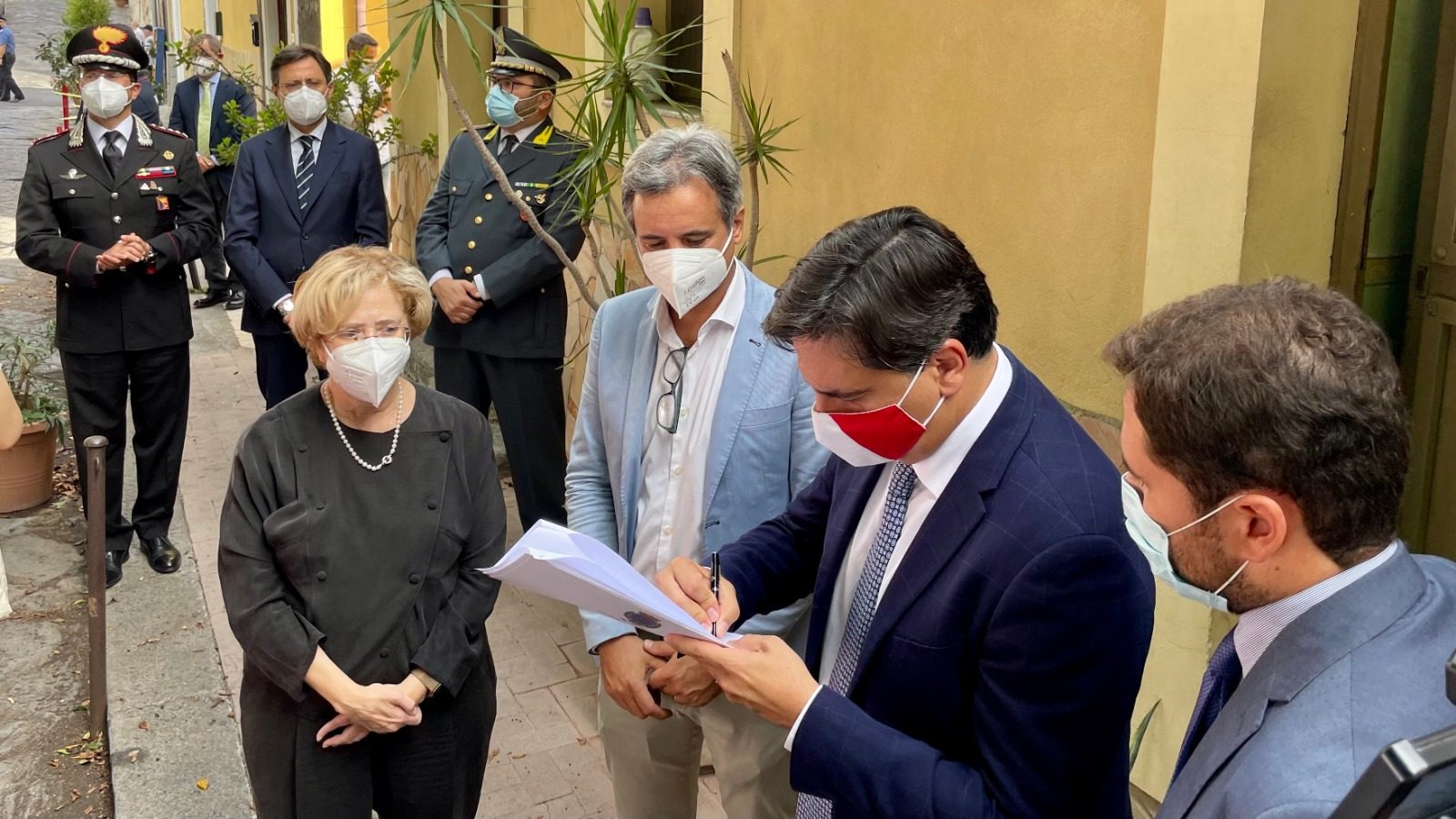 Da patrimonio in mano a cosche mafiose ad abitazioni per famiglie disagiate e per ospitare un centro di promozione sociale curato dal volontariato. Nella storica piazza Santi Cosma e Damiano, ai margini di via Plebiscito, a San Cocimo, cuore del blitz antidroga “Quadrilatero” dei carabinieri dello scorso 20 settembre, il sindaco Salvo Pogliese, alla presenza del prefetto Maria Librizzi, del Questore Vito Calvino e del presidente del tribunale dei minorenni Roberto Di Bella, ha formalizzato la presa in consegna nella disponibilità del Comune di cinque immobili dall’Agenzia Nazionale dei beni confiscati alla mafia, per destinare a scopi di utilità collettiva.