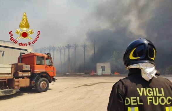 Le fiamme, alimentate dal vento, stanno coinvolgendo ampie aree di vegetazione e sterpaglie, con rischi concreti per diversi capannoni e attività commerciali situate nei pressi dei focolai.