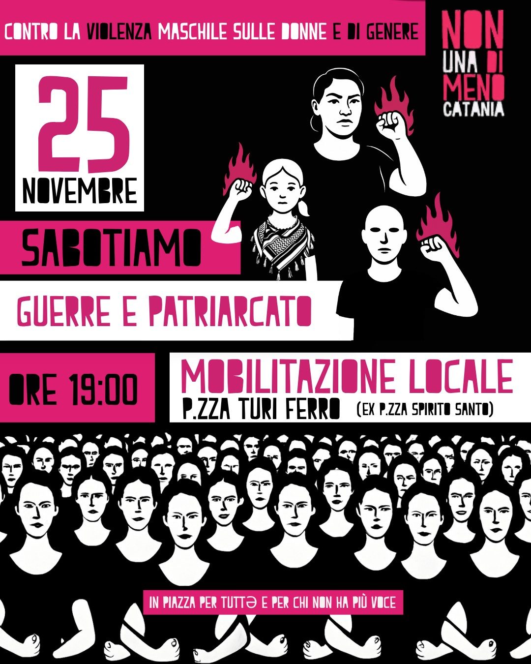 Il 25 novembre Non Una di Meno Catania annuncia una mobilitazione cittadina per denunciare l’aumento della violenza maschile sulle donne e di genere e le politiche che, a livello locale e nazionale, continuano a smantellare strumenti e tutele fondamentali. L’appuntamento della mobilitazione locale sarà a Piazza Turi Ferro (ex Piazza Spirito Santo) dalle ore 19:00.