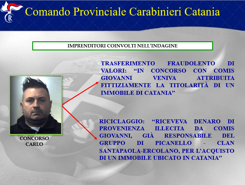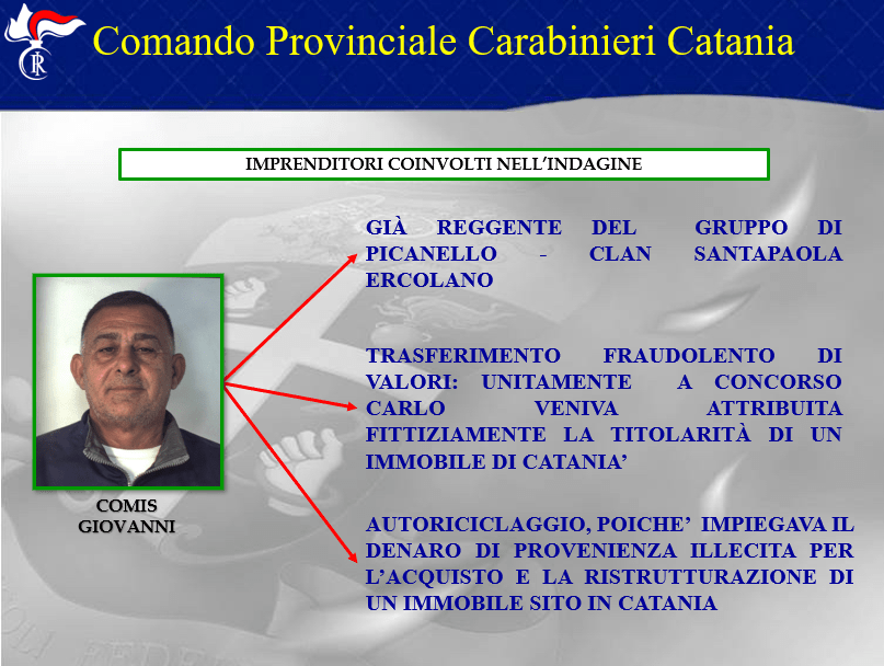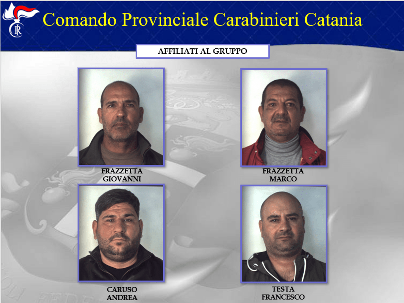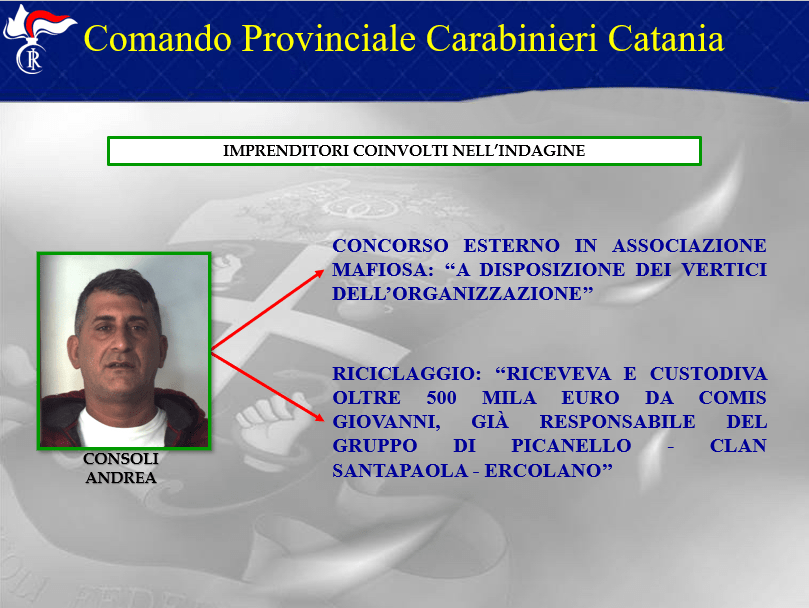 I Carabinieri del Comando Provinciale di Catania, supportati dai reparti specializzati dell’Arma, stanno eseguendo, nelle province di Catania e Vicenza, un’ordinanza di custodia cautelare, emessa dal G.I.P. del Tribunale di Catania, nei confronti di 15 persone ritenute responsabili, a vario titolo, dei reati di associazione di tipo mafioso, concorso esterno in associazione di tipo mafioso, nonché riciclaggio, autoriciclaggio, trasferimento fraudolento di valori e procurata inosservanza di pena, con l’aggravante di aver agito al fine di agevolare la famiglia di Cosa Nostra catanese “Santapaola Ercolano – gruppo di Picanello”.