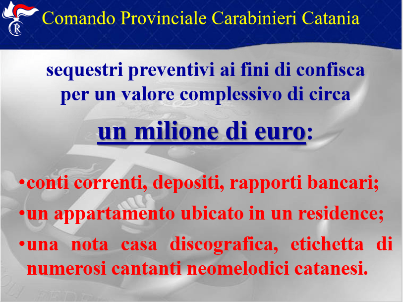 I Carabinieri, al termine di approfonditi accertamenti patrimoniali, hanno proceduto al sequestro preventivo di beni per un valore complessivo di 1 milione di euro, costituiti, tra l’altro, dalla casa discografica “Q Factor Records s.a.s.”, intestata ad uno dei figli del boss e utilizzata da noti cantanti neomelodici.