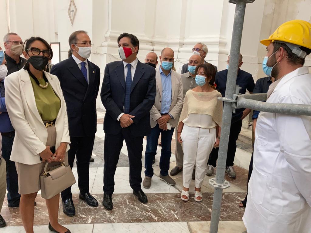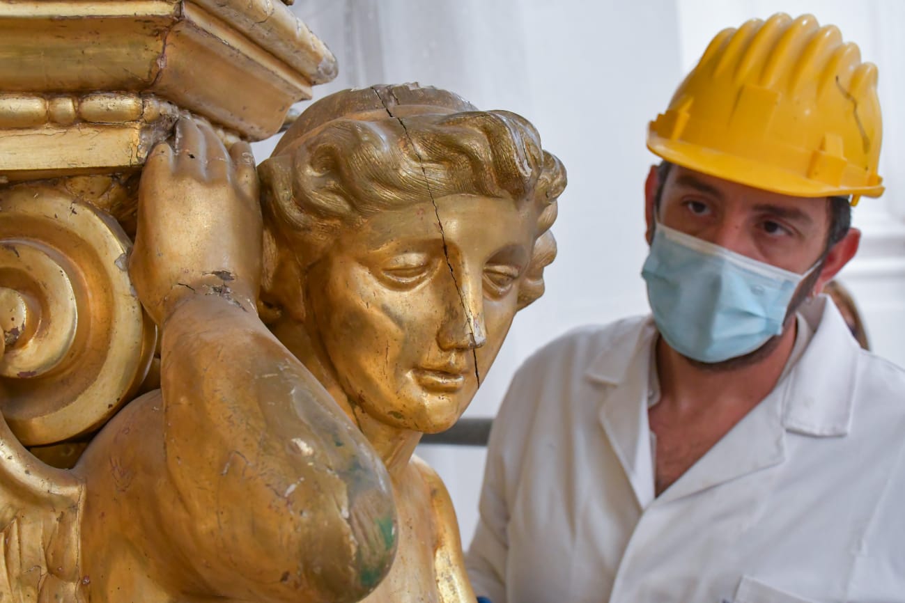 Restauro in corso nella chiesa San Nicolò l’Arena per la Candelora dei Panettieri nell’edificio monumentale di piazza Dante a Catania. Una certosina opera di ricostruzione, curata da esperti restauratori e la supervisione della Sovrintendenza, con l’obiettivo di riportare all’antico splendore uno dei simboli della tradizione agatina. Un lavoro di restyling che il sindaco Salvo Pogliese ha voluto vedere personalmente, insieme all’assessore alla Cultura Barbara Mirabella e al presidente della commissione consiliare Cultura Giovanni Grasso.