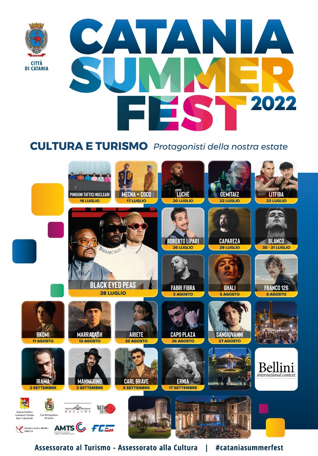 Black Eyed Peas, Blanco, Luchè, Pinguini Tattici Nucleari, Litfiba, Caparezza, Sangiovanni, Rkomi, Irama, Mecna+ Coco, Gemitaiz. E ancora, Roberto Lipari, Fabri Fibra, Ghali, Franco 126, Capo Plaza, Ariete, Marracash, Mannarino, Carl Brave, Ernia. Solo alcuni dei grandi artisti che si esibiranno nel giardino Bellini, la “Villa” di Catania, fulcro di una delle stagioni artistiche e musicali più intense di sempre, tra le più prestigiose d’Italia, il Catania Summer Fest 2022 che il 21 giugno debutterà con il concerto dell’Orchestra nazionale della Rai. Un cartellone di eccezionale valore promosso dal Comune che avrà il suo cardine in un programma di grandi eventi nel parterre naturale del piazzale delle Carrozze nel giardino Bellini, suggestiva cornice teatrale e concertistica capace di accogliere oltre 9mila spettatori.