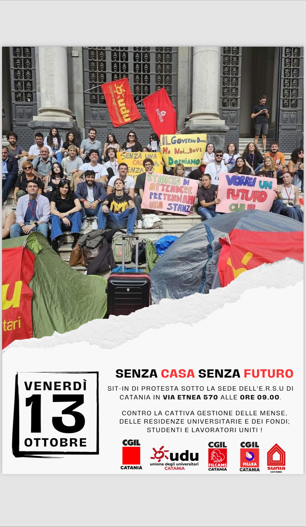 “Senza casa, senza futuro” è il titolo della campagna nazionale promossa da Cgil e UDU sull’abitare. Un sit in è stato fissato per venerdì 13 ottobre alle ore 9 in via Etnea 570, di fronte alla sede dell’ ERSU di CATANIA; la manifestazione è stata organizzata dalla CGIL, dall’Udu, dalla Filcams , dalla Fillea e dal Sunia catanesi.