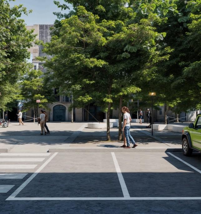 Le aree oggi occupate da parcheggi e traffico disordinato diventeranno ampie zone pedonali attrezzate, con spazi ombreggiati, sistemi di raffrescamento naturale e aree dedicate a eventi, mercati e attività culturali.