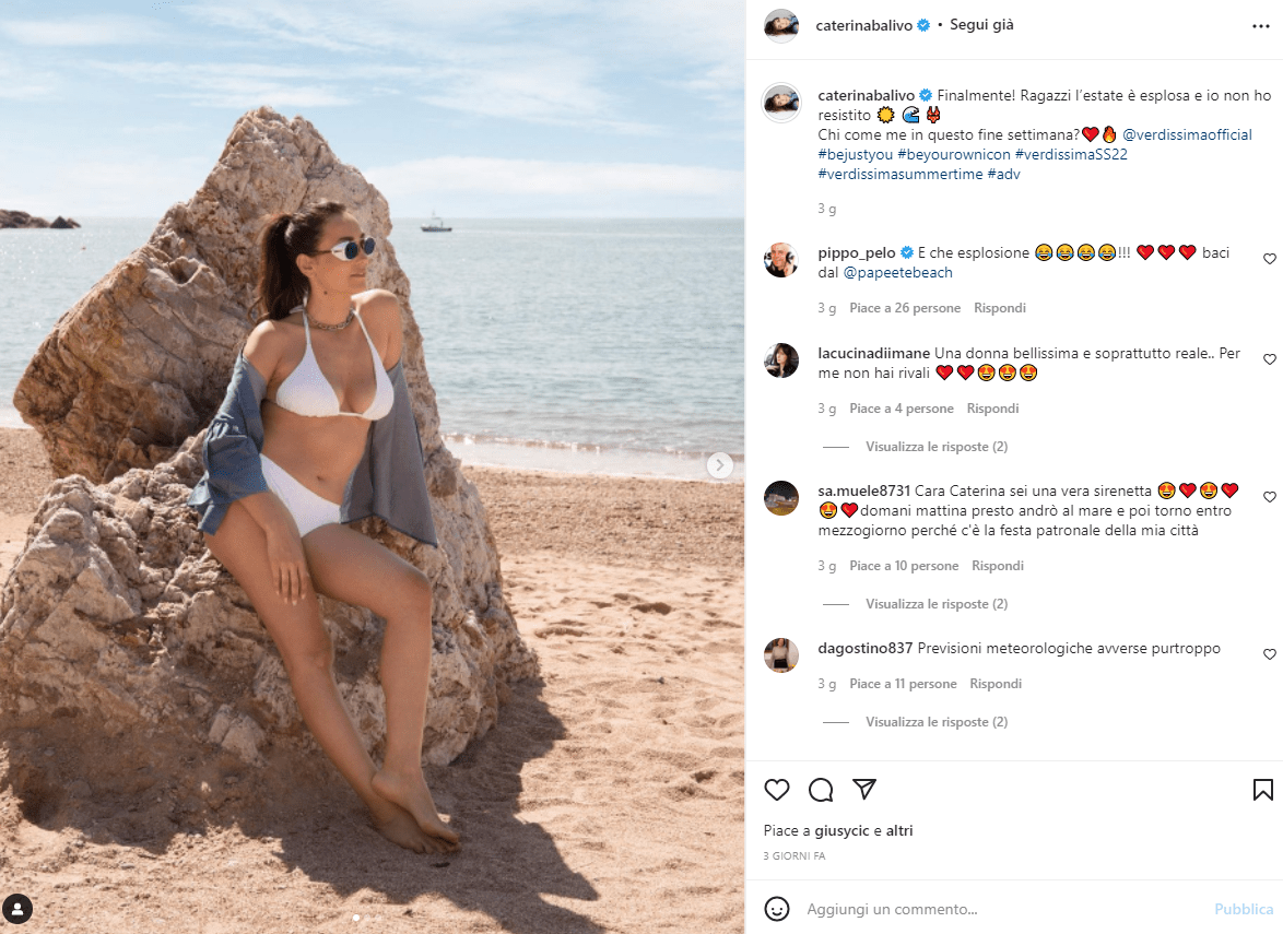 Non solo in tv. Anche sui social, come mostrato, Caterina Balivo condivide spesso messaggi di body positivity. “Rotolini? Pancetta o panciona, smagliature bianche o rosse? Bacino più largo dopo i parti? E allora?!? W il bikini”, ha scritto l’anno scorso su Instagram sfoggiando il primo costume della stagione.