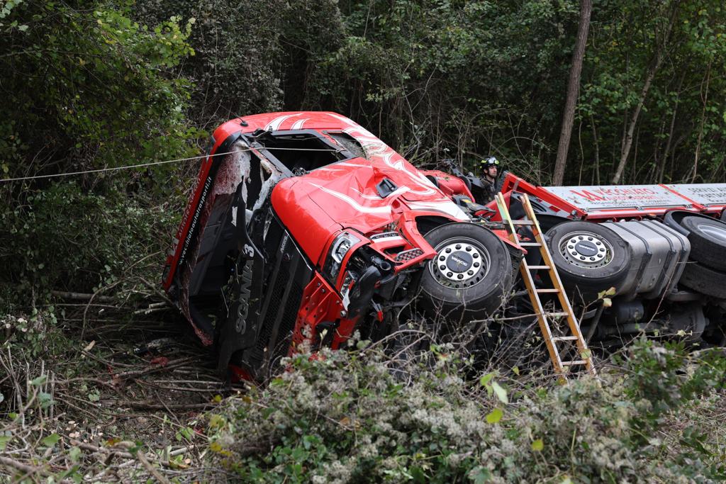 Il tir è sbandato a destra, finendo per ribaltarsi.