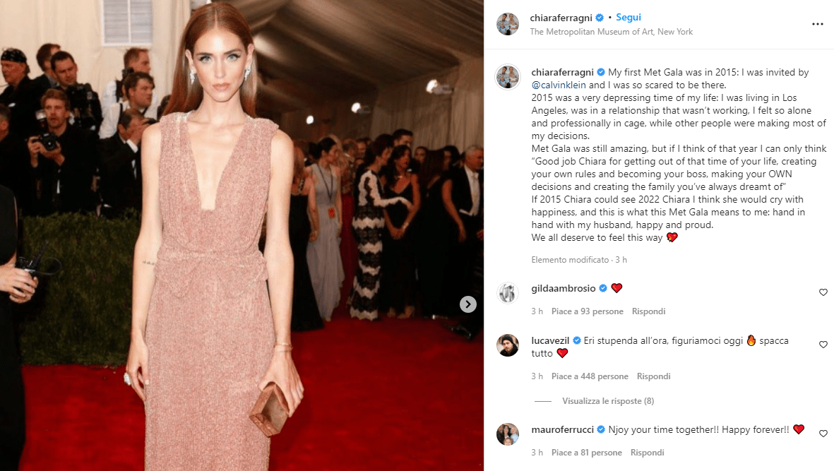 Chiara ha da poco condiviso un post su Instagram in cui ha pubblicato le foto sul red carpet dell’evento, mentre indossava uno scintillante abito da sera: “Il 2015 è stato un periodo molto deprimente della mia vita vivevo a Los Angeles – scrive – avevo una relazione che non funzionava, mi sentivo così solo e professionalmente in gabbia, mentre altre persone prendevano la maggior parte delle mie decisioni. Il Met Gala è stato comunque fantastico, ma se penso a quell’anno posso solo pensare “Buon lavoro Chiara per uscire da quel momento della tua vita, creare le tue regole e diventare il tuo capo, prendere le tue decisioni e creare la tua famiglia ho sempre sognato”.
