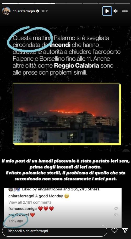 Nella sua Storia l’influencer ha postato la notizia dell’incendio che sta avvolgendo Palermo, sottolineando come fosse successiva al momento in cui ha postato le foto. “Il mio post di lunedì piacevole – ha scritto – è stato postato ieri sera, prima degli incendi di ieri notte. Evitate polemiche sterili, il problema di quello che sta succedendo non sono sicuramente i miei post”.