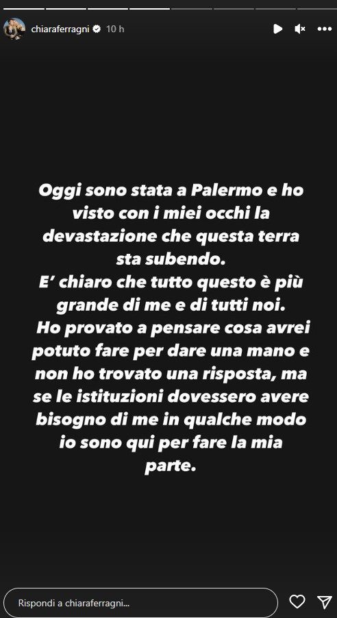 Dopo essersi “scagionata”, la Ferragni ha poi postato un’altra Storia per parlare della grandissima emergenza che sta colpendo Palermo: “Oggi sono stata a Palermo e ho visto con i miei occhi la devastazione che questa terra sta subendo. É chiaro che tutto questo è più grande di me e di tutti noi”.