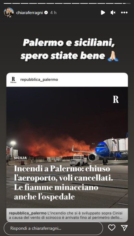 Chiara Ferragni ormai ci ha fatto il callo alle polemiche e una delle ultime ha riguardato addirittura l’orario in cui mangiano i figli. In ogni caso deve aver letto dei commenti critici nei suoi confronti e ha pubblicato una Storia per inviare il suo sostegno ai palermitani, che devono fare i conti con un grave incendio all’aeroporto.