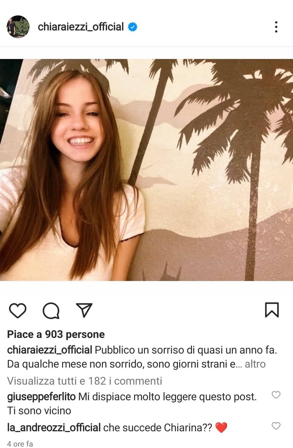 Sul post si legge: “Pubblico un sorriso di quasi un anno fa. Da qualche mese non sorrido, sono giorni strani e complessi, spesso subisco violenze senza motivo. Questo un piccolo messaggio per chiedere se si può smettere la violenza su di me”. La mancanza di espressioni positive del viso è stata sottolineata da Chiara, che denuncia queste angherie e che chiede quindi una aiuto concreto. Non si sa comunque se questo messaggio sia stato di ammonimento nei confronti di qualcuno in particolare che lei ha deciso comunque di non rendere nota. L’ex del Grande Fratello Filippo Nardi in un commento le ha chiesto di spiegarsi meglio, ma lei ha risposto soltanto con un ringraziamento per tutti quelli che le hanno mostrato vicinanza.