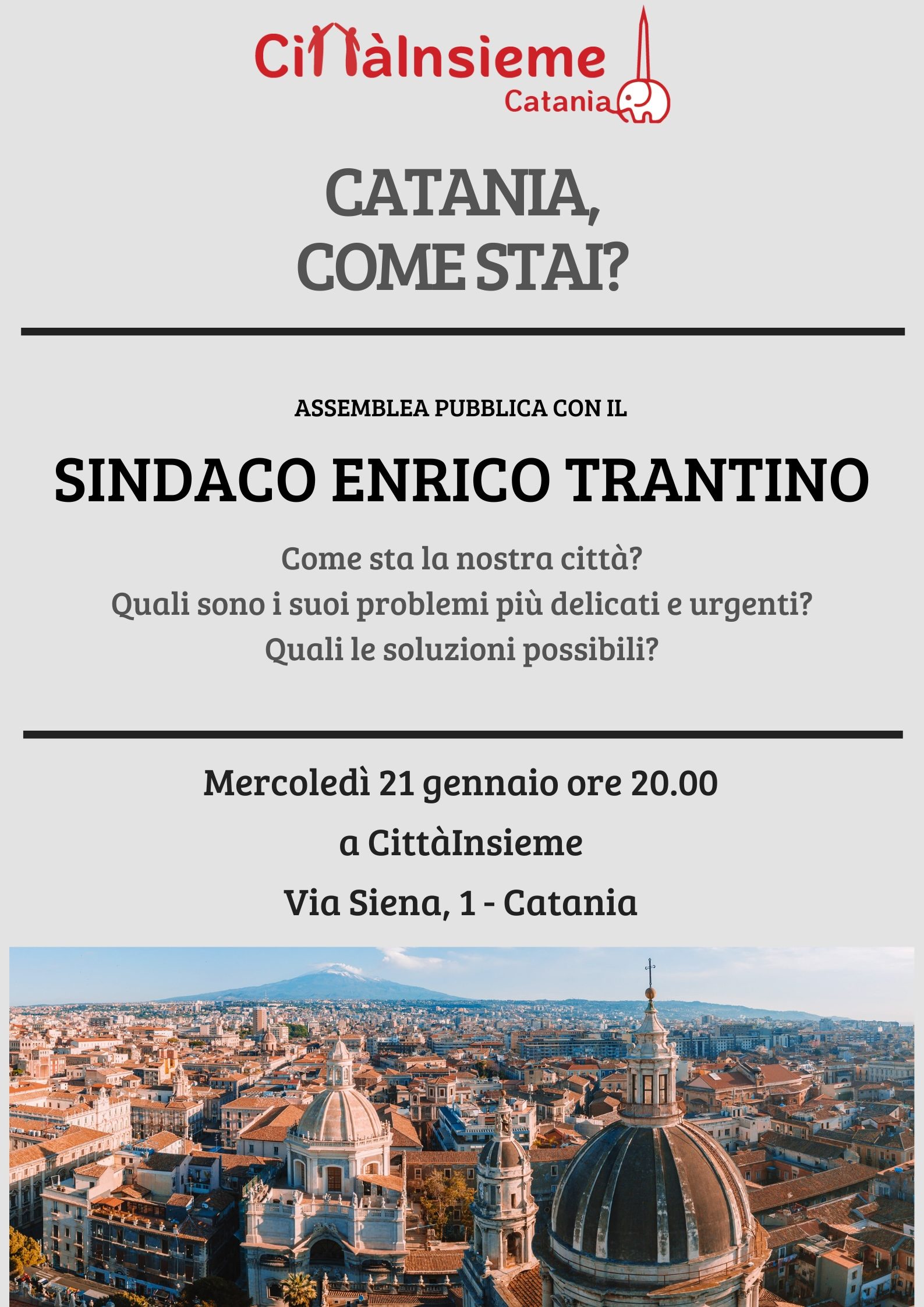 Nel corso dell’assemblea ci confronteremo con il Sindaco sullo stato attuale di Catania, ponendo domande e chiedendo chiarimenti sulla sua visione complessiva della città, sulle linee politiche che hanno guidato finora l’azione amministrativa e sui problemi più urgenti e delicati che incidono quotidianamente sulla vita dei cittadini.